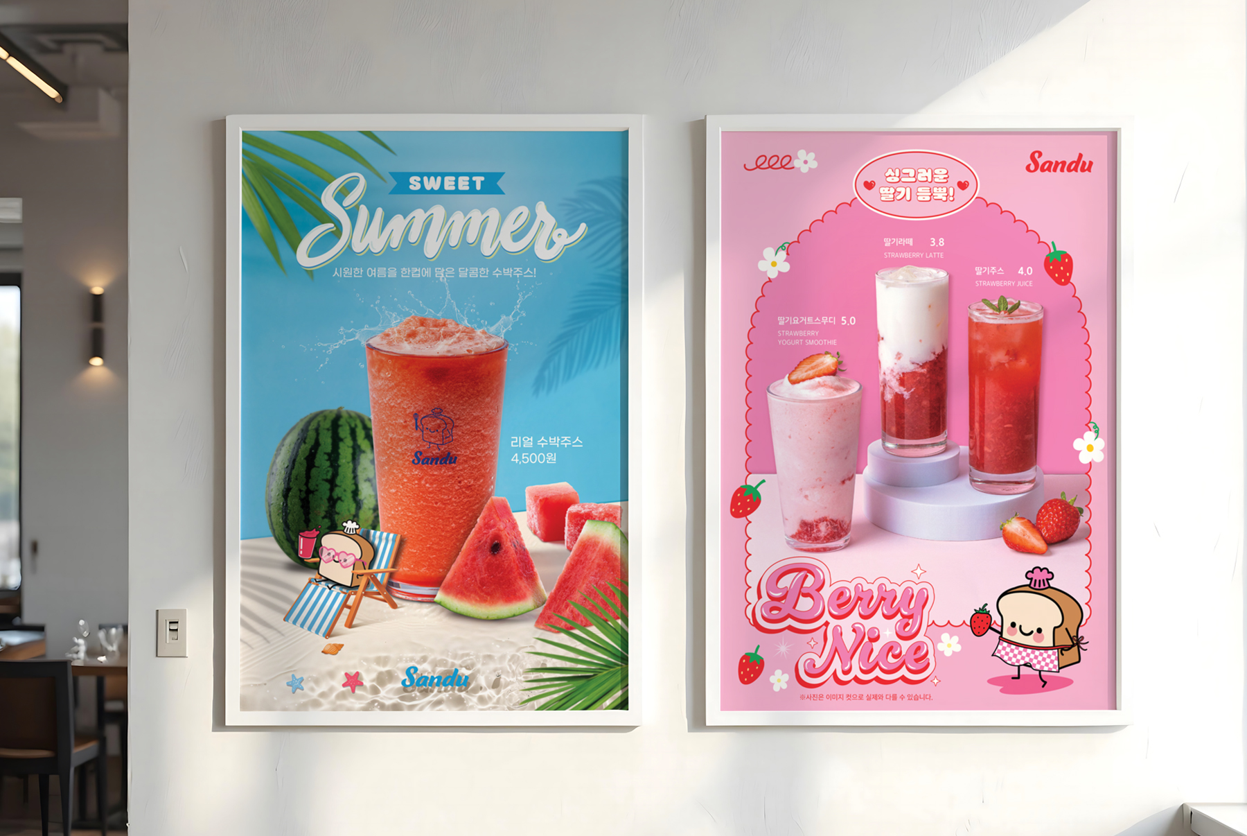 수박주스 포스터 , 들기름 메밀면 포스터, 딸기음료3종 포스터