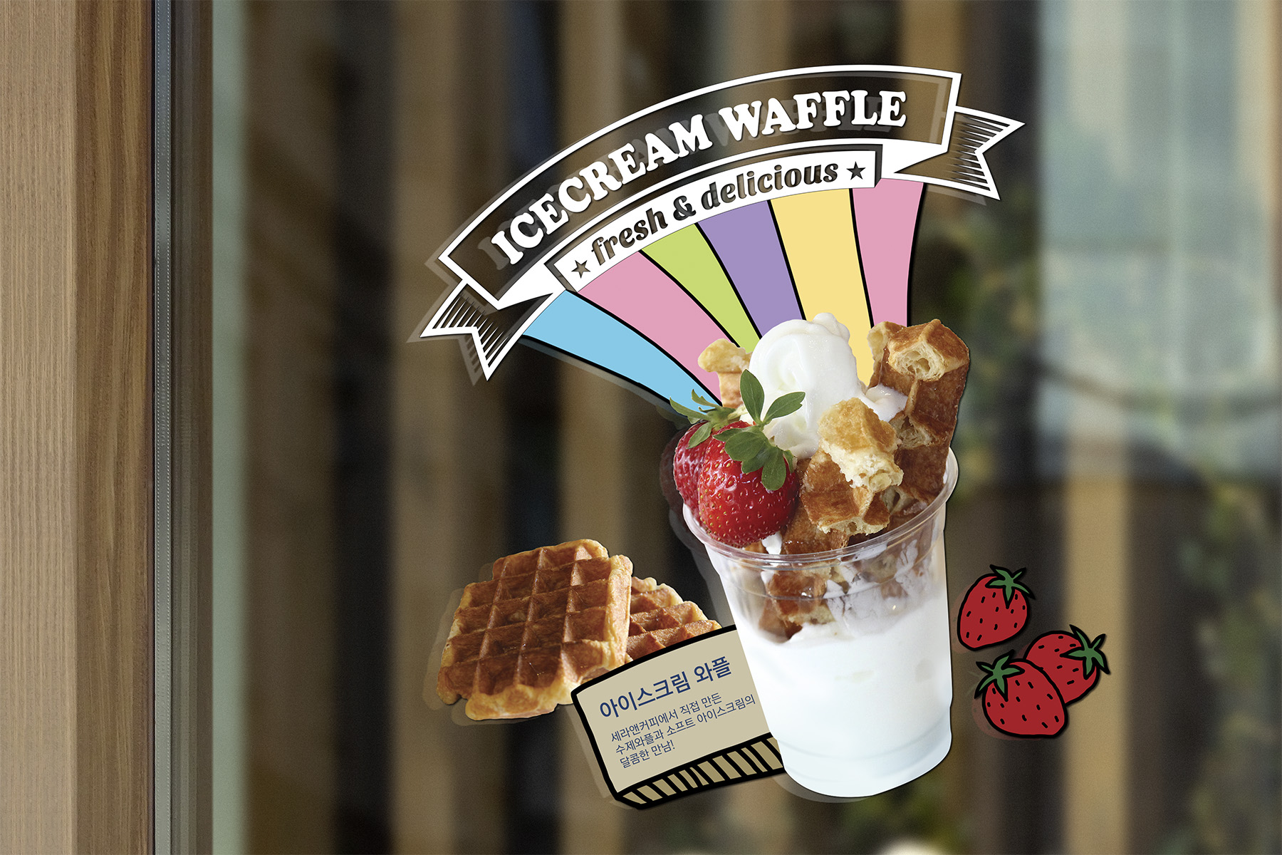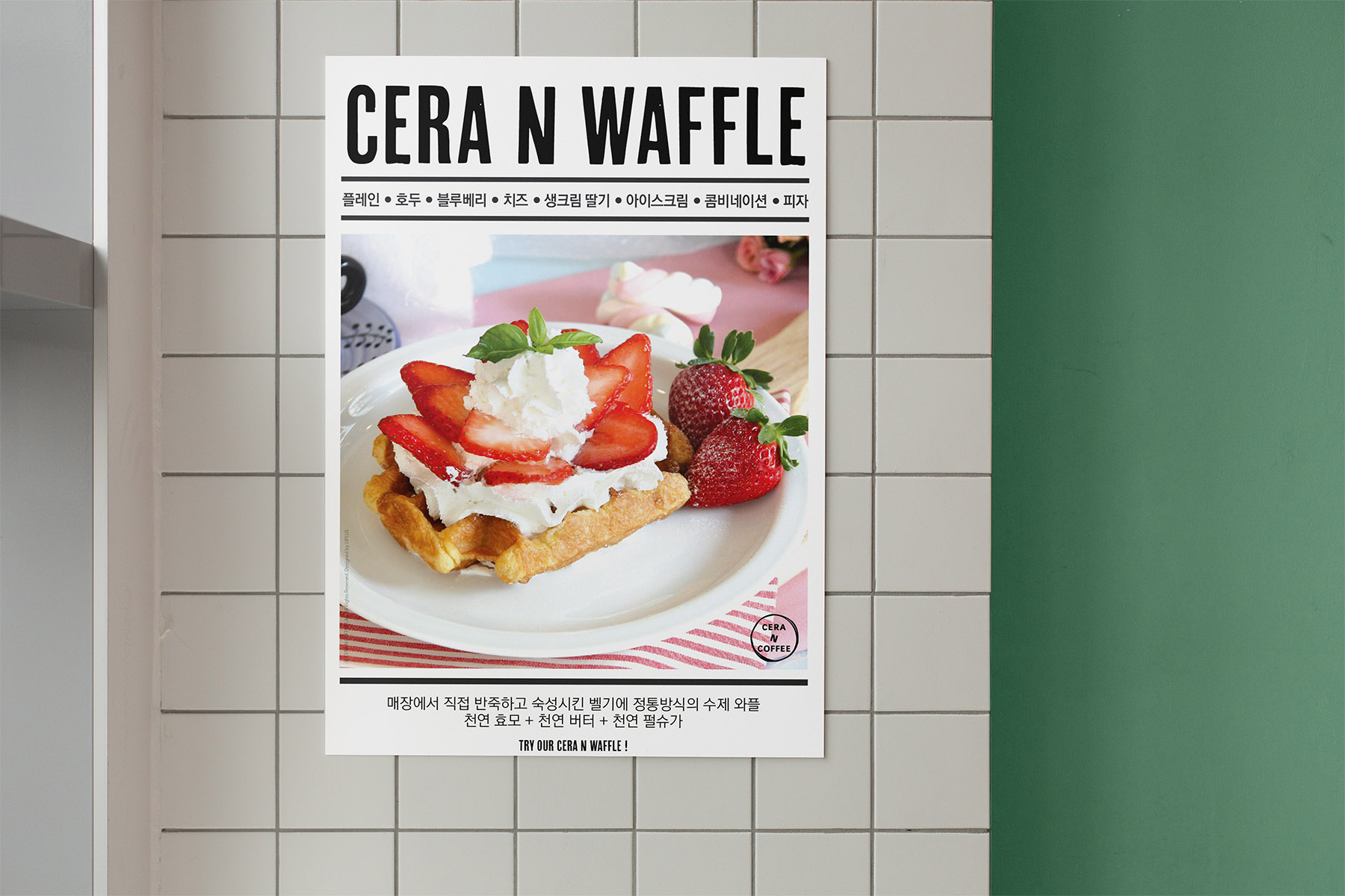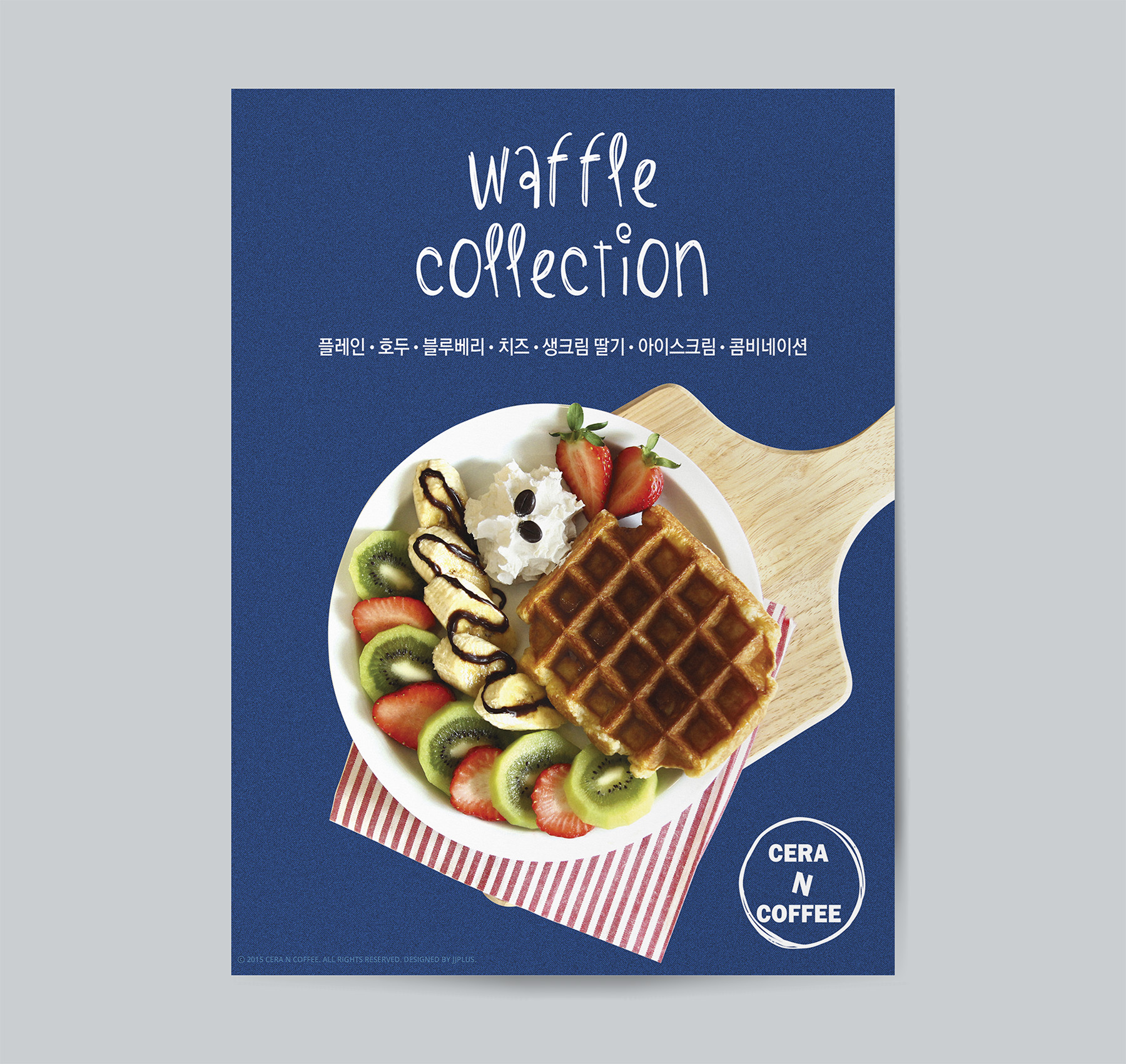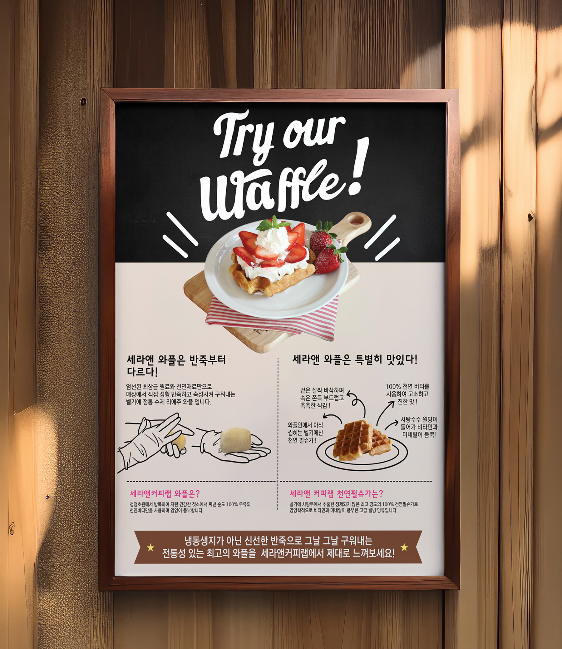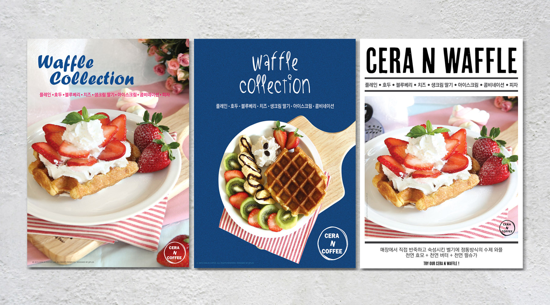 촬영, 포스터 디자인 모두 제이제이플러스에서 진행하였다.제품을 강조하면서 촌스럽지 않은 디자인을 구상하였으며이국적인 색감, 폰트 등에 느낌을 살려주어오래 두고 보아도 질리지 않을 포스터 디자인이다.세라앤커피에서 맛본 수제와플과 산양유로 만든 아이스크림이 질리지 않듯.